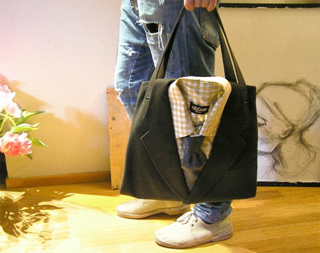 Geanta neobisnuita creata dintr-un sacou vintage, camasa si cravata.