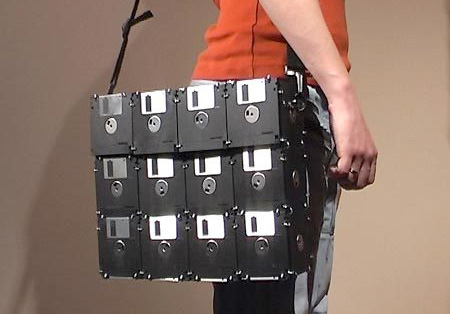 Geanta pentru laptop facuta din 42 de dischete reciclate.