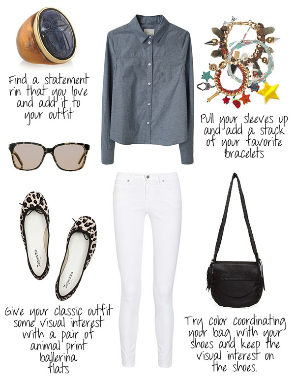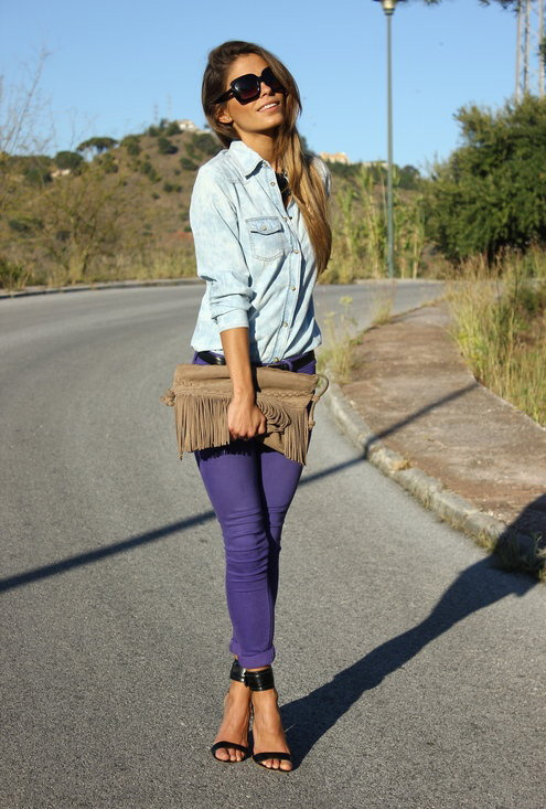 6. Camasile chambray arata uimitor cu blugii albi. Pentru a nu fi prea simpla tinuta, poti adauga o multime de accesorii indraznete.