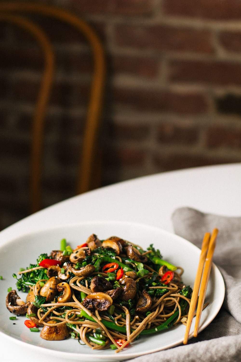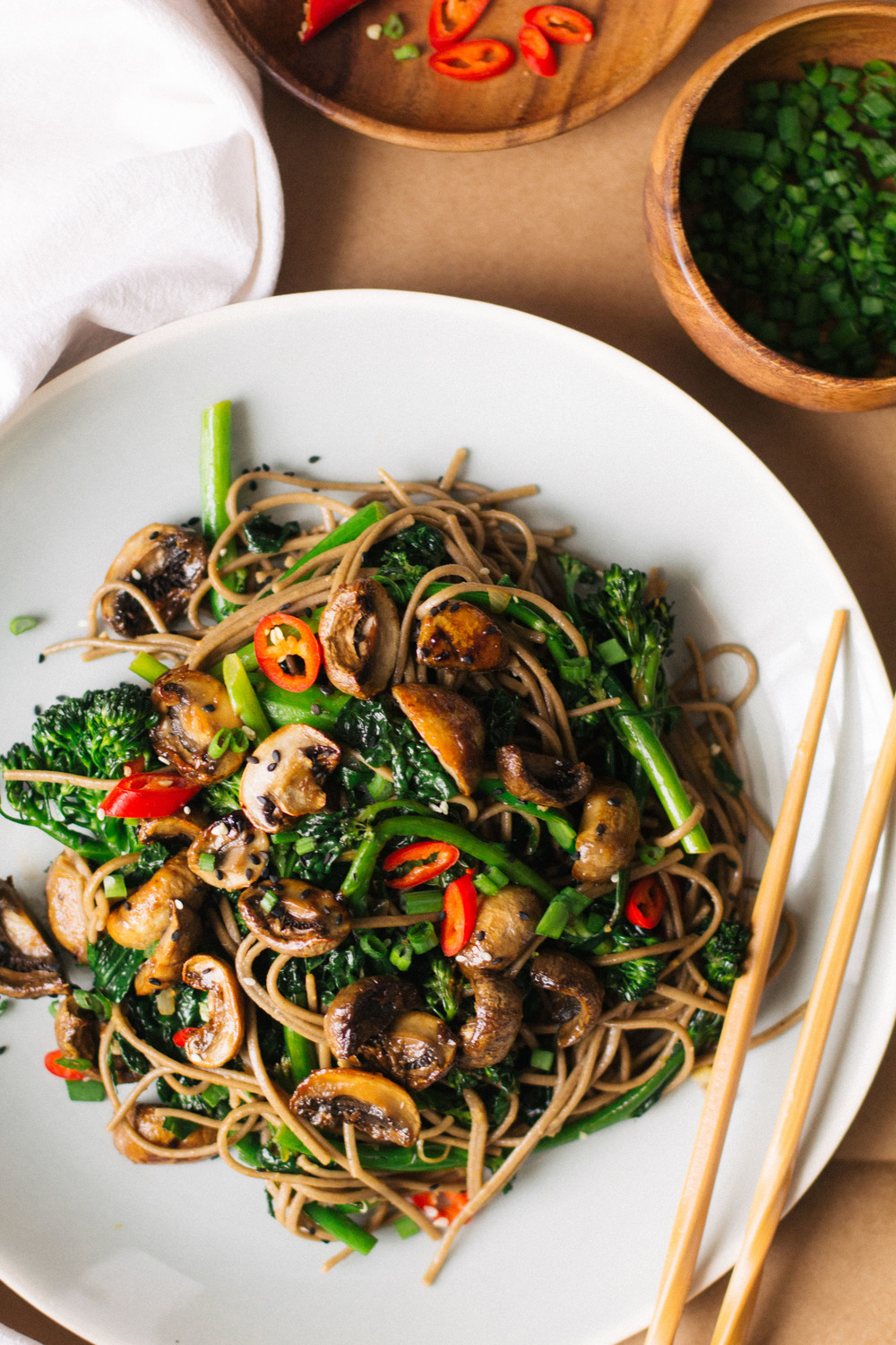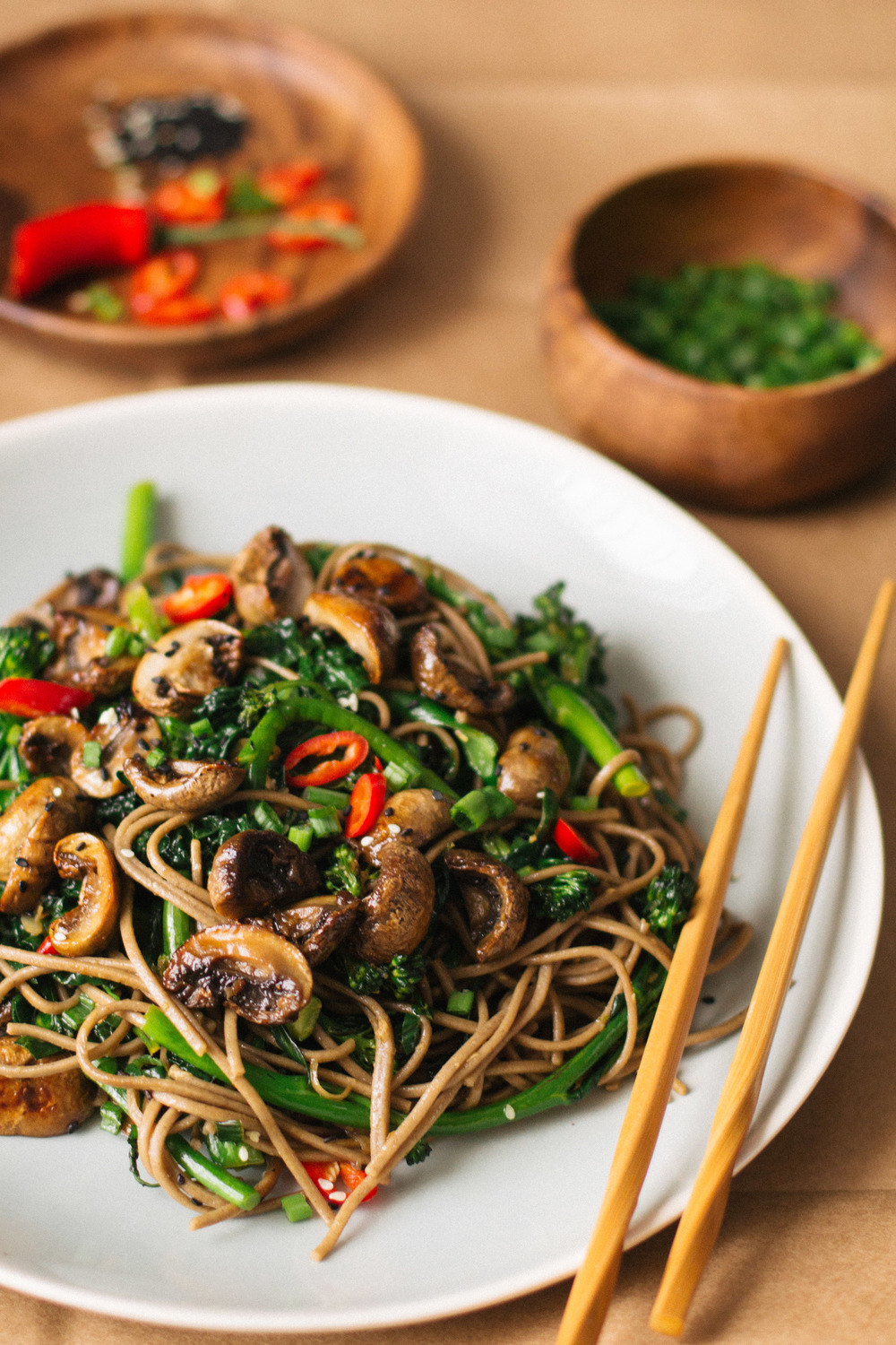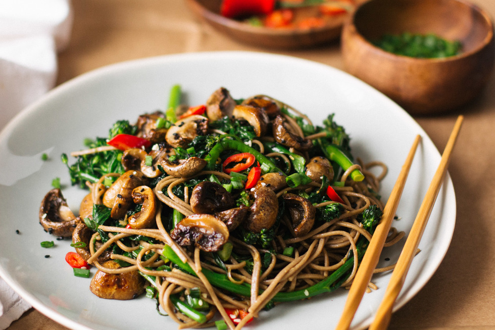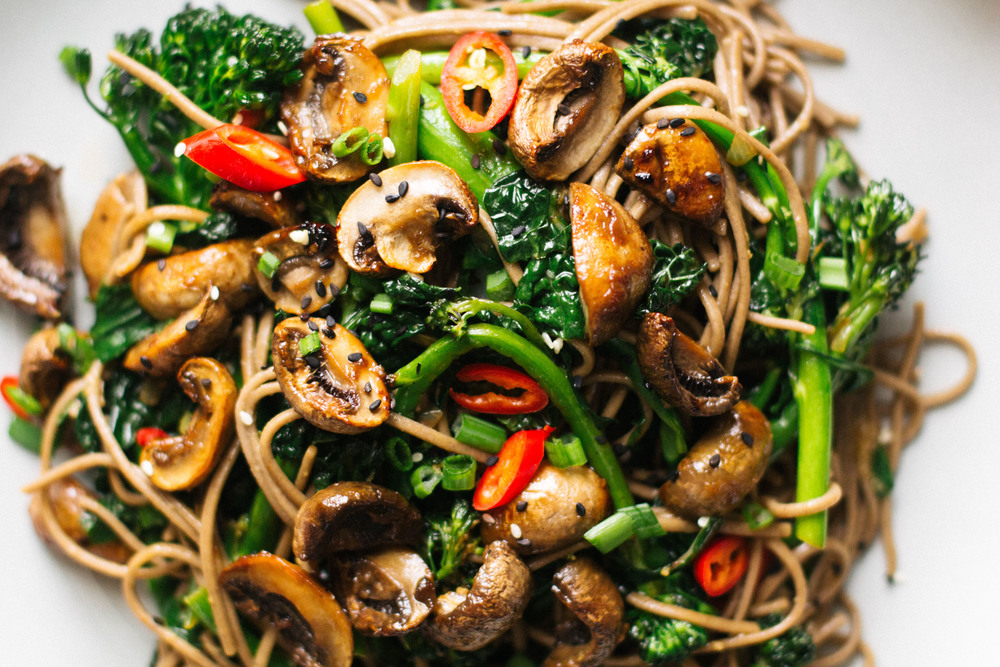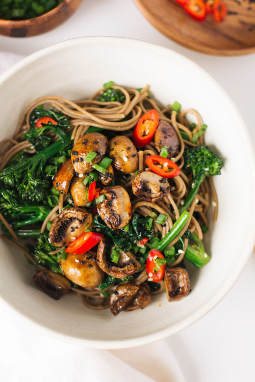 Aceasta metoda de a gati ciupercile ar putea fi utilizata cu tot felul de bucatarii. O glazura in stil mexican pentru tacos cu ciuperci sau o glazura in stil italian pentru paste cu ciuperci ar fi delicioasa. Am ales sa servesc ciupercile peste taitei soba din faina de hrisca cu broccoli si varza Kale. Elementele consistente ale farfuriei vin impreuna cu un sos dulce, acru, sarat si usor picant, combinatia perfecta pentru aceasta perioada a anului.