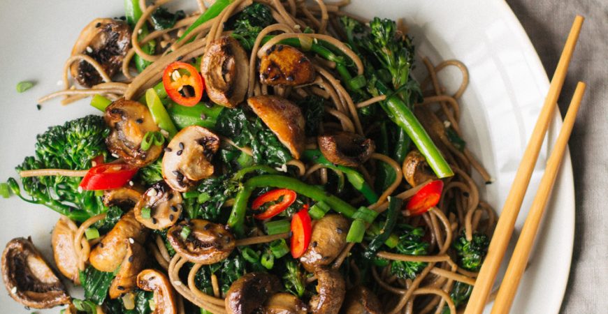 Ciuperci teriyaki prajite si taitei soba cu broccoli