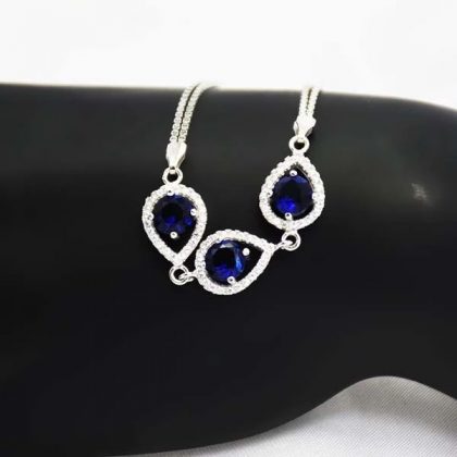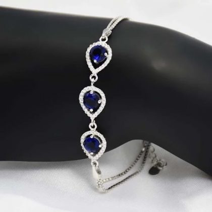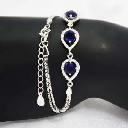 Bratara din argint 925 cristale este un accesoriu elegant și strălucitor decorat cu cristale într-o nuanță de albastru închis. Materialul argintiu este lucios și durabil, oferind un aspect elegant și rafinat. Cristalele albastre îi oferă o notă de subtilitate. Aceasta are o lungime de 20 cm si o prelungire de 5 cm.