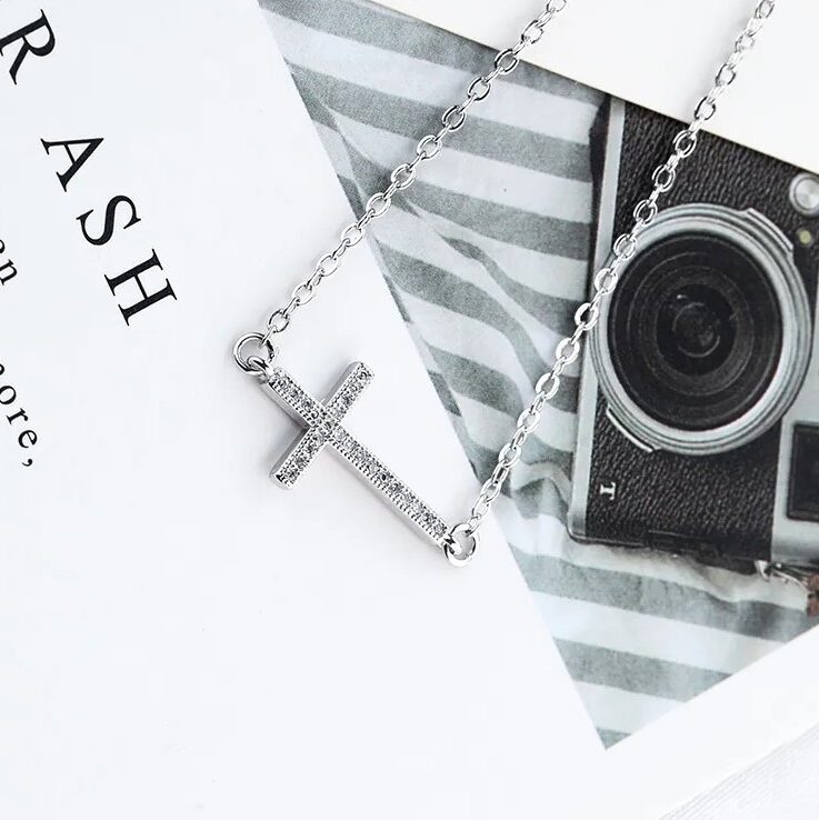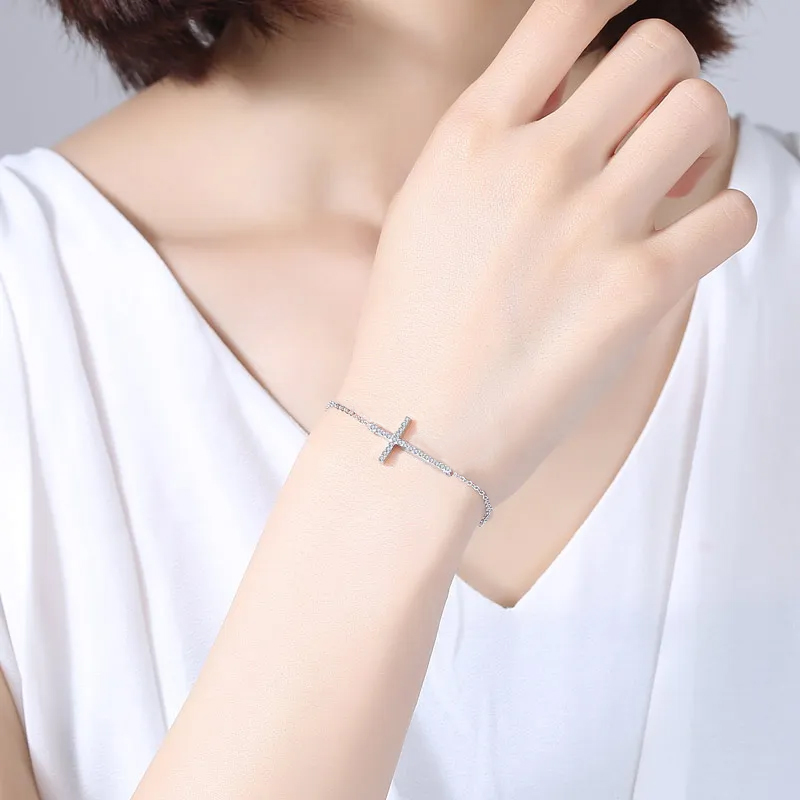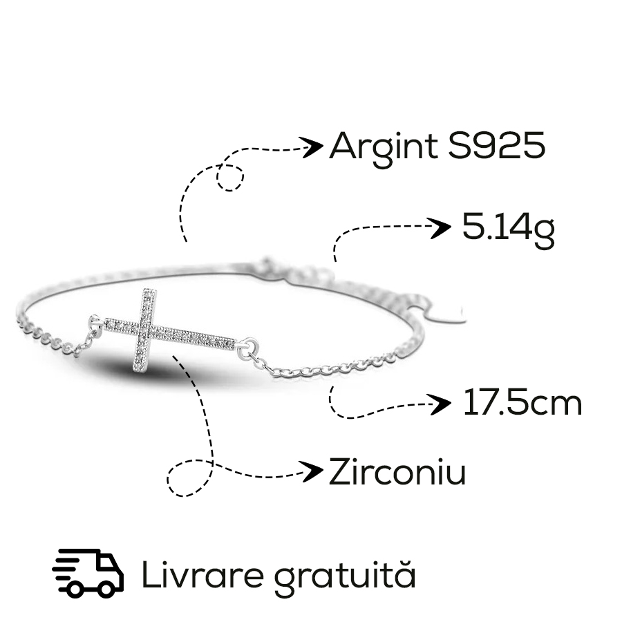În centru, brățara este încununată de o cruciuliță fin lucrată, semnul universal al credinței și spiritualității. Această cruciuliță mică, dar semnificativă, este suspendată cu grijă de lanțul subțire al brățării. Fiecare detaliu al cruciuliței este sculptat cu atenție, exprimând o simplitate elegantă, în timp ce semnificația sa profundă poate aduce un sentiment de protecție și ghidare purtătorului.