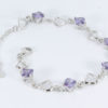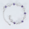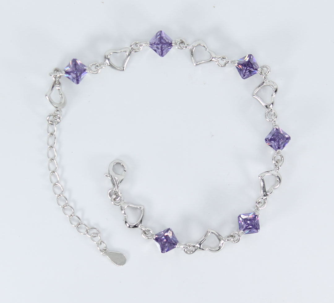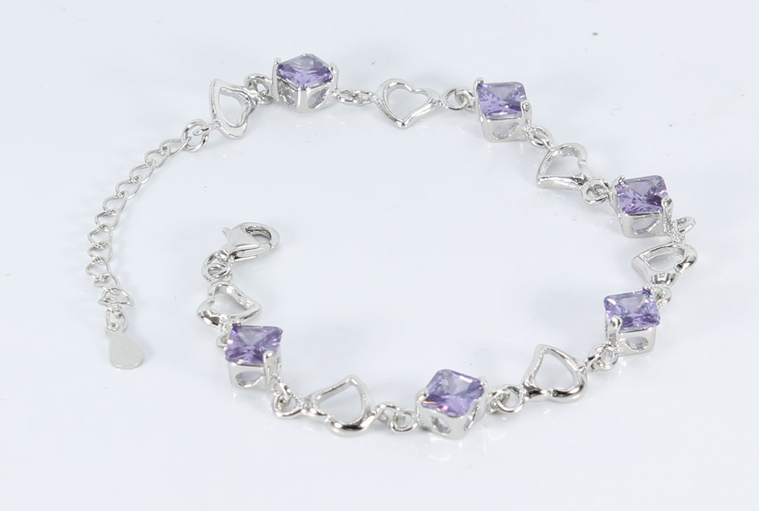 Pentru a adăuga o notă subtilă de culoare și strălucire, brățara este încrustată cu zirconiu mov. Aceste pietre prețioase de culoare mov aduc un efect subtil de eleganță și rafinament, captând privirile și emanând o strălucire discretă. Prin simbolismul inimioarelor și frumusețea zirconiului mov, această brățară strălucește ca o expresie a afecțiunii și stilului personal.