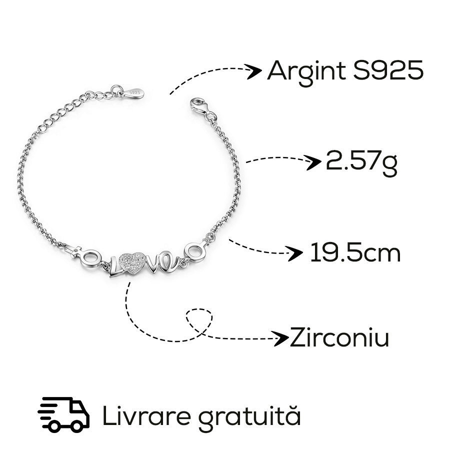 Bratara din argint 925 Love cu pietre zirconiu este confecționată din argint strălucitor, un metal prețios apreciat pentru aspectul său clasic și strălucirea radiantă. În centrul brățării se află un pandantiv sub forma cuvântului „love”, care simbolizează iubirea și pasiunea. Acest pandantiv este decorat cu pietre de zirconiu, care strălucesc ca diamantele, adăugând strălucire și eleganță.