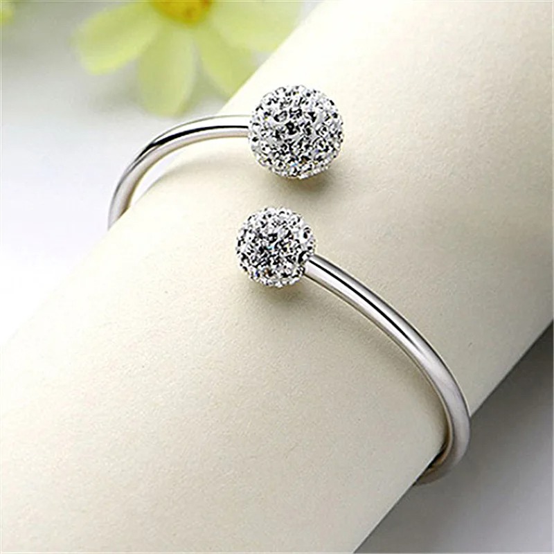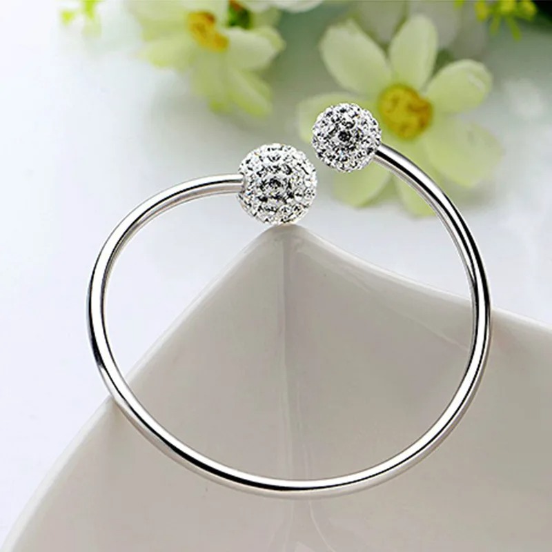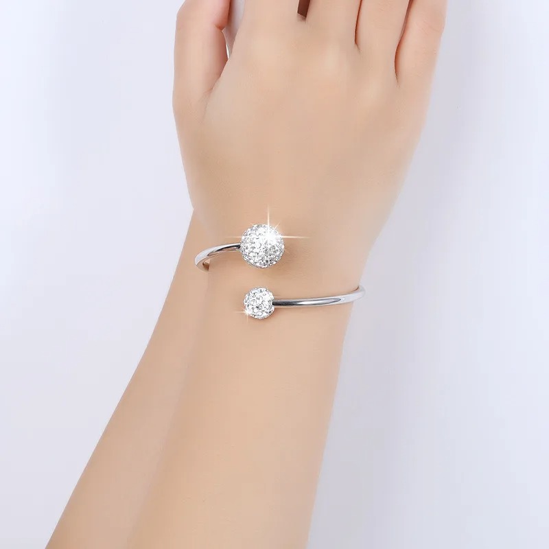 Cele două bile pline cu cristale mici din zirconiu amplifică frumusețea acestei brățări. Marginea rigidă a brățării conferă un aspect modern și contemporan, făcând din aceasta o bijuterie versatilă, potrivită pentru a fi purtată la orice ocazie, de la evenimente speciale la întâlniri de zi cu zi.