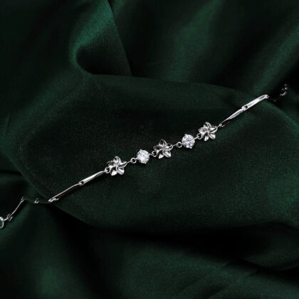 Cele trei floricele sunt punctele focale ale brățării și adaugă o notă subtilă de romantism. Aceste detalii florale sunt pline de rafinament, ceea ce face ca bijuteria să fie fermecătoare. Cele două cristale din zirconiu, plasate strategic între floricele, adaugă strălucire și eleganță, capturând și reflectând lumina într-un mod spectaculos.