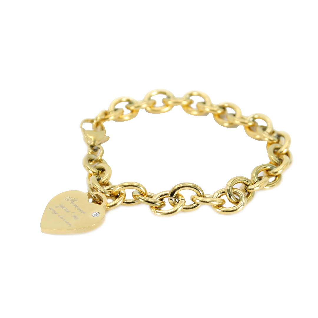 Inimioara este plasată central pe brățară, captând privirile datorită formei sale simetrice și a contururilor perfect definite. În centrul inimioarei este gravat un text special, cuvinte încărcate de emoție și semnificație pentru purtătorul brățării.