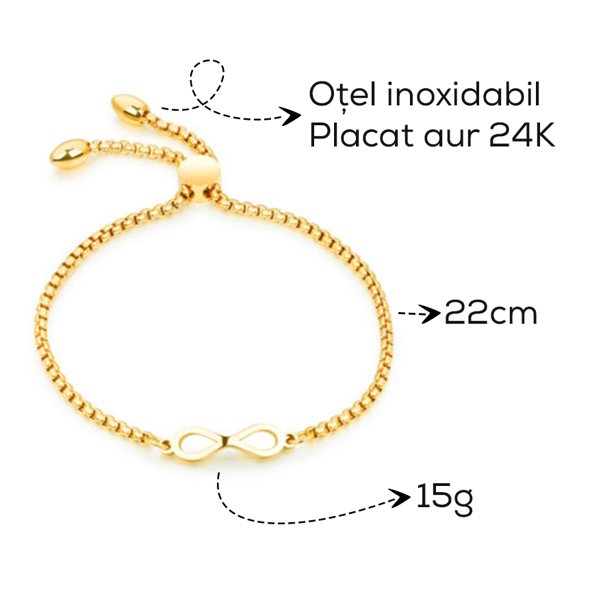Bratara dama placata aur infinit 24K aduce o combinatie minunată între rafinament și simbolismul eternității. Semnul infinit, în formă de buclă continuă, reprezintă ideea de continuitate, fără sfârșit și eternitate. Aceasta simbolizează legăturile fără seamăn dintre suflete, iubirea fără sfârșit și dorința de a fi unite într-un mod inseparabil.