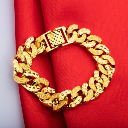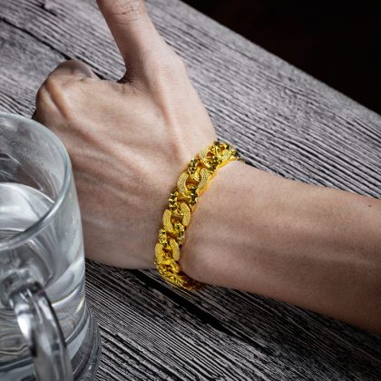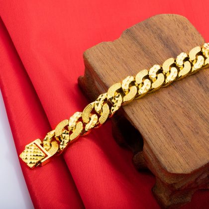 Bratara deosebita placata aur este o bijuterie elegantă și rafinată, potrivită pentru a fi purtată în orice ocazie specială sau pentru a completa cu stil ținutele de zi cu zi. Aceasta este realizată dintr-un amestec de aliaje comune, acoperit cu un strat subțire de aur. Datorită finisajului placat cu aur, brățara capătă un aspect luxos și strălucitor asemănător aurului veritabil.