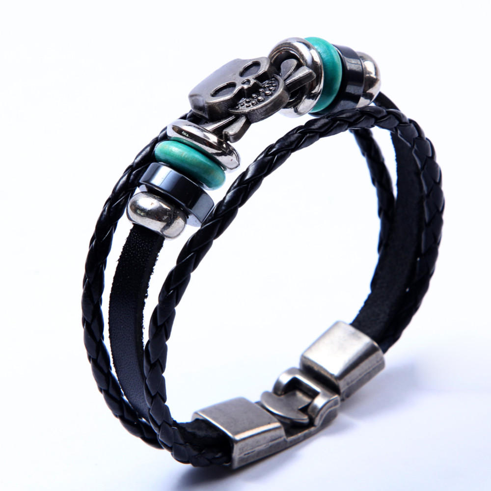 Bratara din piele si inox se asorteaza tinutelor urban si casual. Aceasta este compusa din mai multe straturi negre din piele cu pietre si are amuleta in forma de cap de schelet.