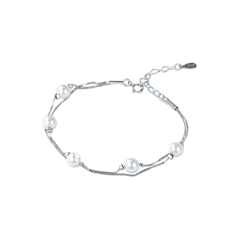 Brățara este compusă din două lanțuri subțiri de argint, care se împletesc armonios într-un singur accesoriu. Primul lanț este decorat cu trei perle elegante, iar cel de-al doilea cu două perle. Perlele, simboluri ale purității și eleganței, adaugă un efect subtil de strălucire și rafinament bijuteriei.