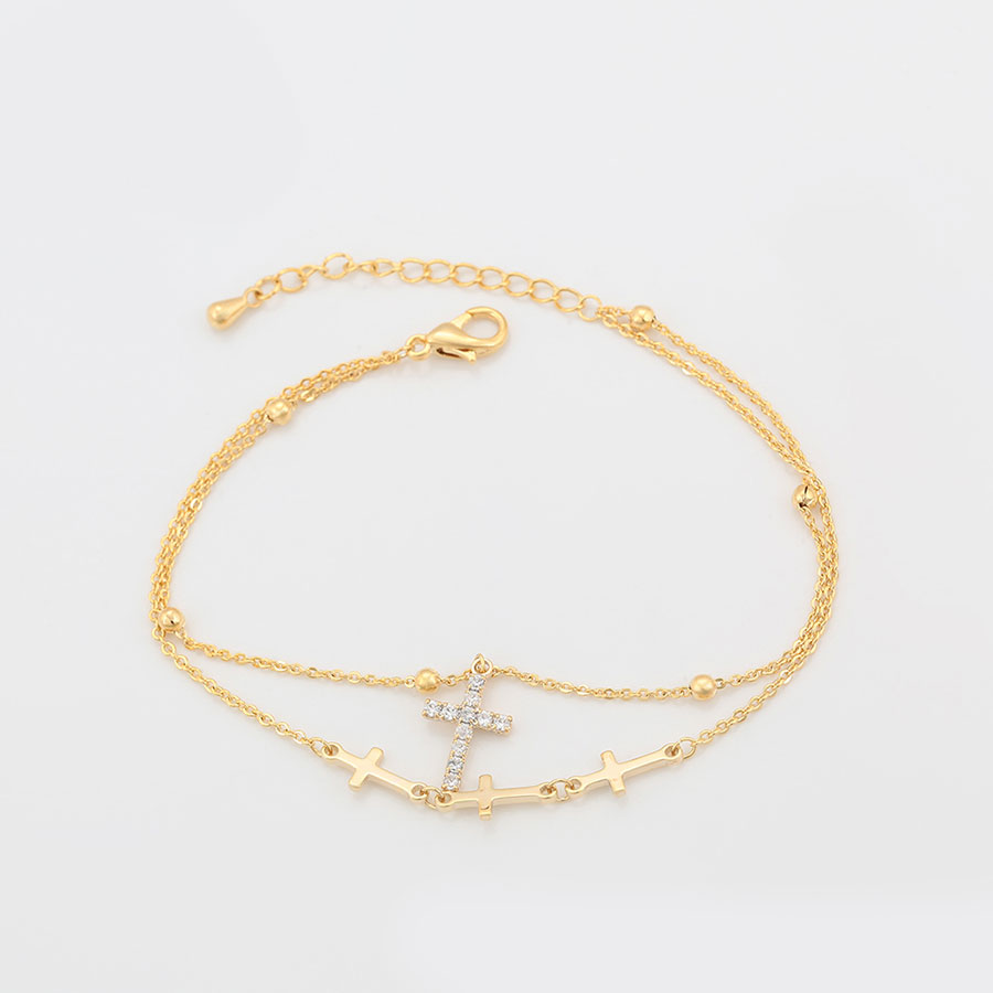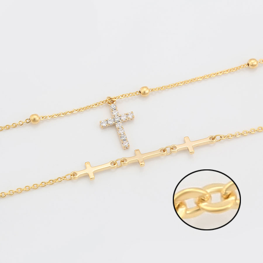 Bratara dubla cruciulite placata aur este o bijuterie elegantă și distinctivă, care prezintă un design subtil, dar semnificativ. Această brățară este confecționată dintr-un amestec de aliaje comune, care este apoi placat cu un strat subțire de aur pentru a conferi un aspect lucios și strălucitor.