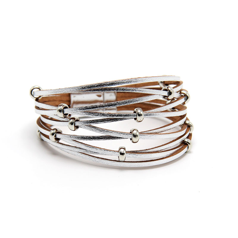 Această brățară este realizată din piele naturală de înaltă calitate, aleasă cu grijă pentru a asigura durabilitatea și frumusețea în timp. Culoarea argintie este obținută prin tehnici speciale de vopsire și finisare, conferind brățării un aspect metalic și modern.