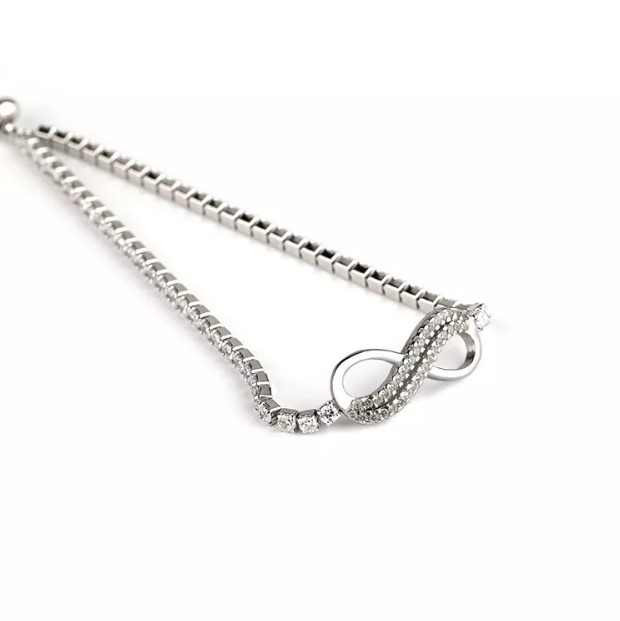 Această brățară din argint cu modelul semnului infinitului și pietre zirconiu adaugă o notă de strălucire și semnificație oricărei ținute. Cu semnificația sa profundă și detaliile strălucitoare, este o bijuterie care va atrage toate privirile și va aduce o notă de eleganță și semnificație în viața ta.