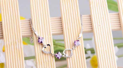 Bratara cu inimioare din argint 925 zirconiu poate fi asortata perfect la tinute de ocazie cat si la una de serviciu. Designul său este elegant și romantic, cu două inimioare care pozitionate pe mijlocul brățării. De-a lungul brățării sunt încrustate trei pietre strălucitoare în formă de romb din zirconiu mov. Aceste pietre adaugă o notă de culoare și strălucire bijuteriei.