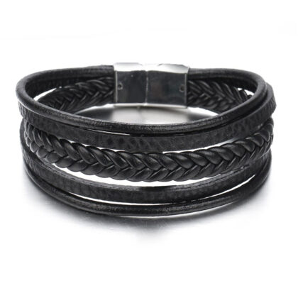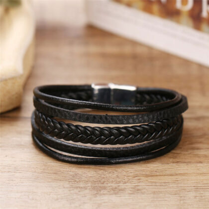 Bratara piele neagra impletita reprezintă un accesoriu clasic și versatil, ce emană un farmec simplu și rafinat. Confecționată din piele de înaltă calitate, această brățară se remarcă prin textura sa distinctivă și prin aspectul său impletit.