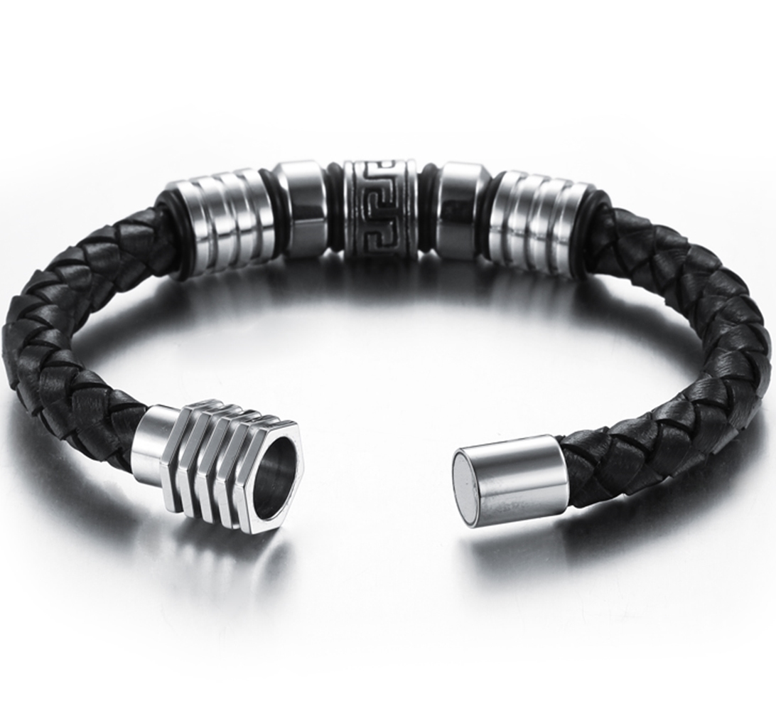 Această brățară impletită din piele neagră cu o amuletă din oțel inoxidabil este un accesoriu versatil și potrivit atât pentru bărbați, cât și pentru femei si poate fi purtat într-o varietate de situații, de la ținutele casual la cele mai elegante, oferind un aspect modern și sofisticat.