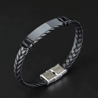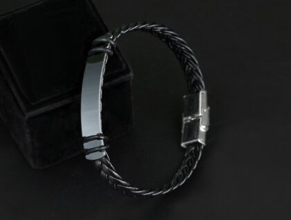 Bratara din piele si stainless steel neagra este un accesoriu de modă care integrează elemente tradiționale precum pielea cu elemente moderne precum oțelul inoxidabil, toate încadrate într-o nuanță de negru elegantă.