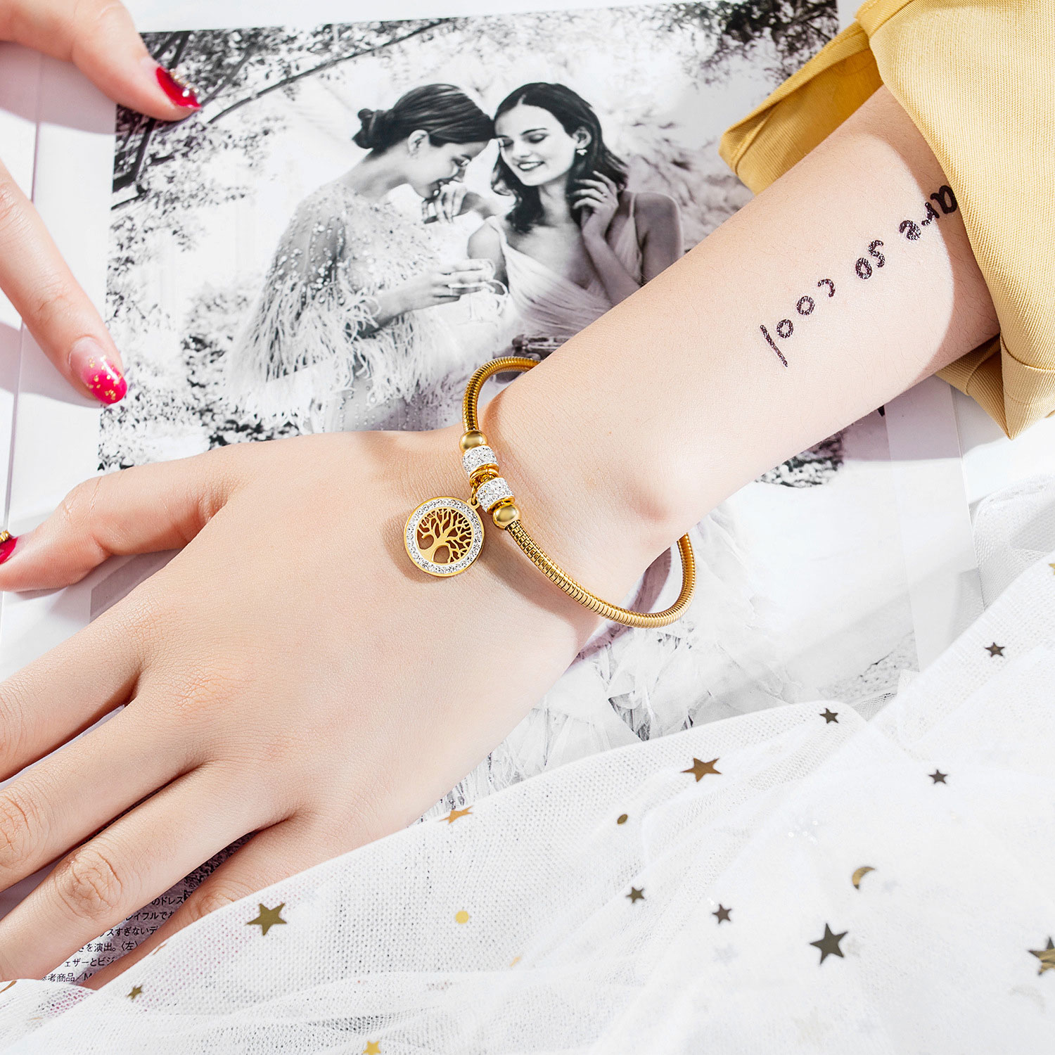 Bratara placată cu aur, în formă de copac al vieții și încrustată cu cristale, este o bijuterie care îmbină simbolismul copacului vieții cu strălucirea cristalelor și eleganța placării cu aur. Copacul vieții este un simbol puternic, prezent în multe culturi și tradiții, și este asociat cu viața, fertilitatea, înțelepciunea și conexiunea cu natura.