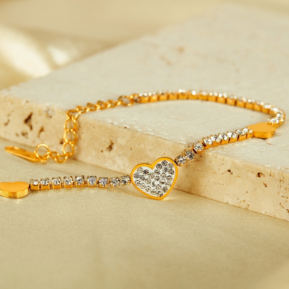 Bratara placata aur cu cristale si inimioare este o bijuterie elegantă și rafinată, potrivită pentru a fi purtată în orice ocazie specială sau pentru a completa cu stil ținutele de zi cu zi. Aceasta este realizată dintr-un amestec de aliaje comune, acoperit cu un strat subțire de aur. Datorită finisajului placat cu aur, brățara capătă un aspect luxos și strălucitor asemănător aurului veritabil.