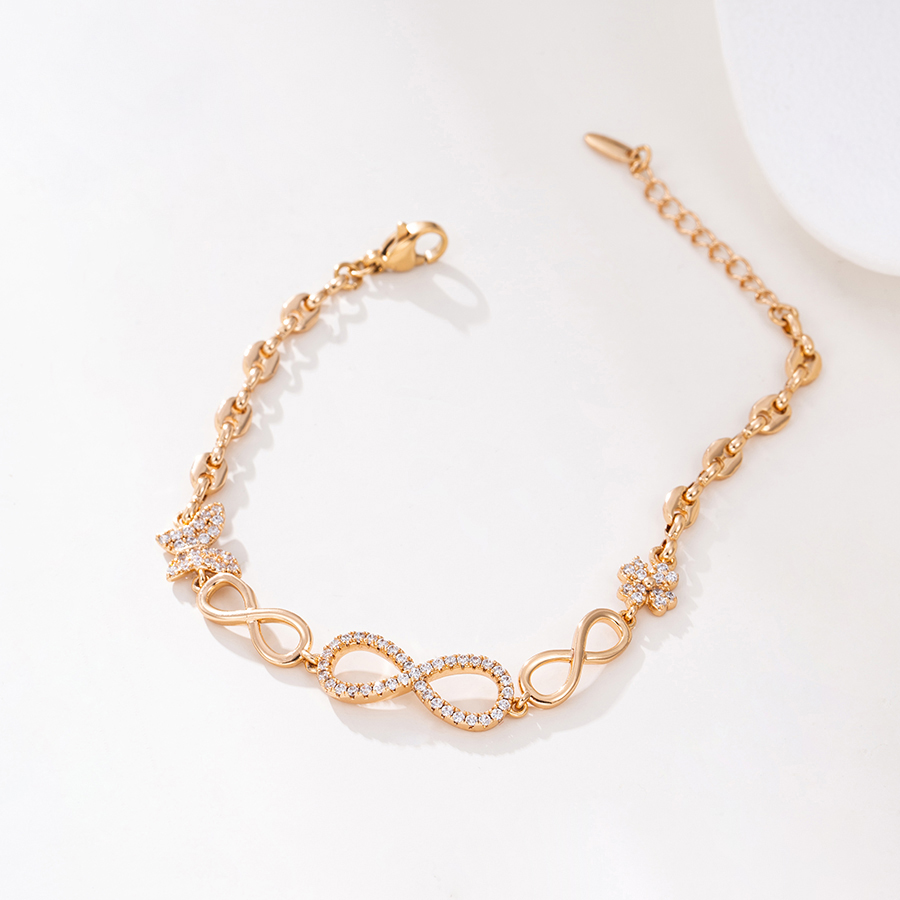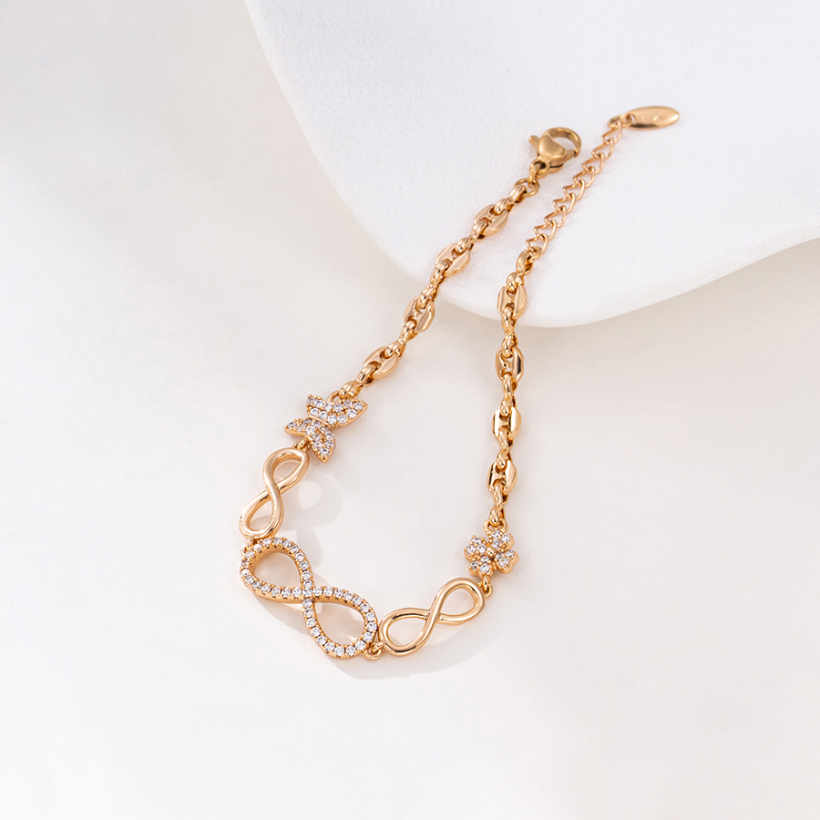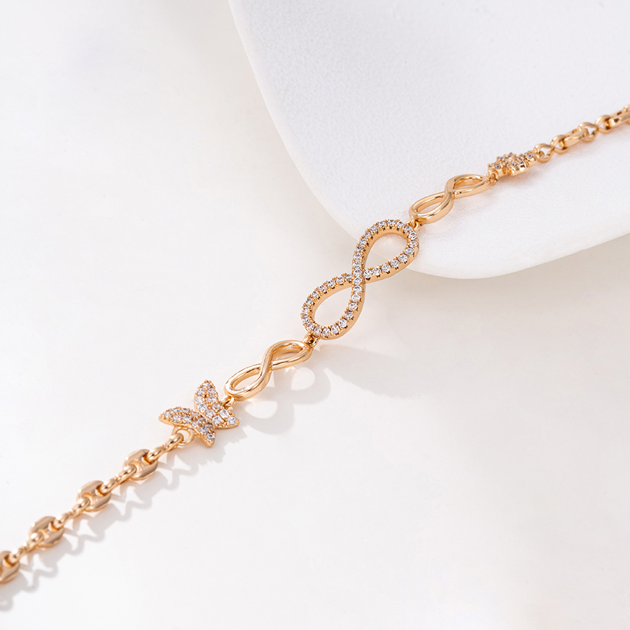 Bratara placata aur este o adevărată declarație de stil și eleganță, îmbinând simboluri delicate și detalii rafinate. Designul său cuprinde semnele infinitului împodobite cu cristale strălucitoare, care evocă ideea de iubire eternă și legături fără sfârșit. Alături de acestea, un fluture delicat și o floare sclipitoare adaugă un strop de grație și feminitate, transformând brățara într-un omagiu adus frumuseții naturii și renașterii.