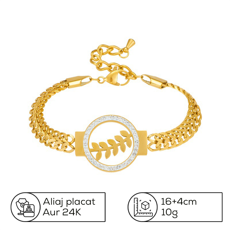 Bratara placata aur model frunzulite este o bijuterie cu o eleganță aparte, menită să aducă o notă de strălucire și rafinament oricărei ținute. Pandantivul rotund este încrustat cu zirconiu pe margine, adăugând un aspect strălucitor întregii bijuterii.