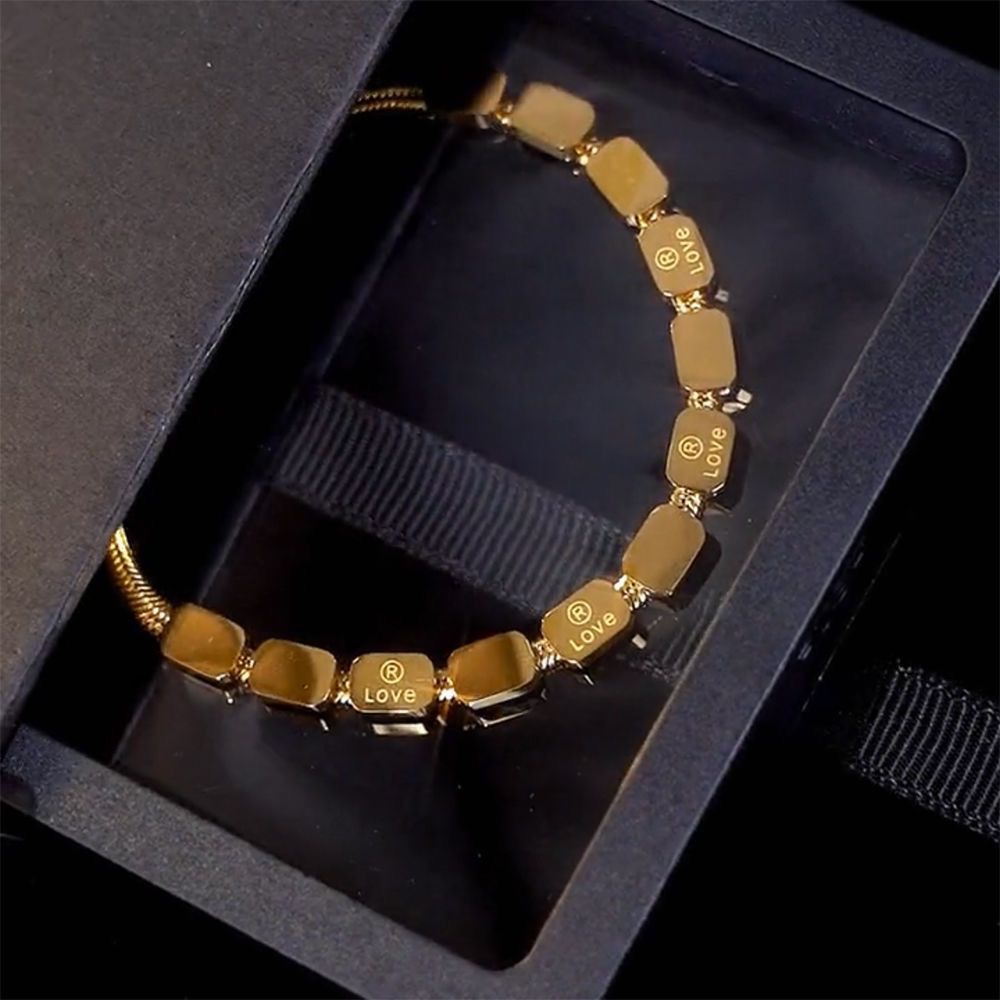 Bratara placata aur model rectangular aduce o eleganță subtilă și modernă. Partea din față este formată din multiple dreptunghiuri aliniate simetric, interconectate armonios, care creaza un aspect fluid și sofisticat. Lungimea și proporțiile sunt concepute cu atenție pentru a oferi o prezență subtilă, dar memorabilă.