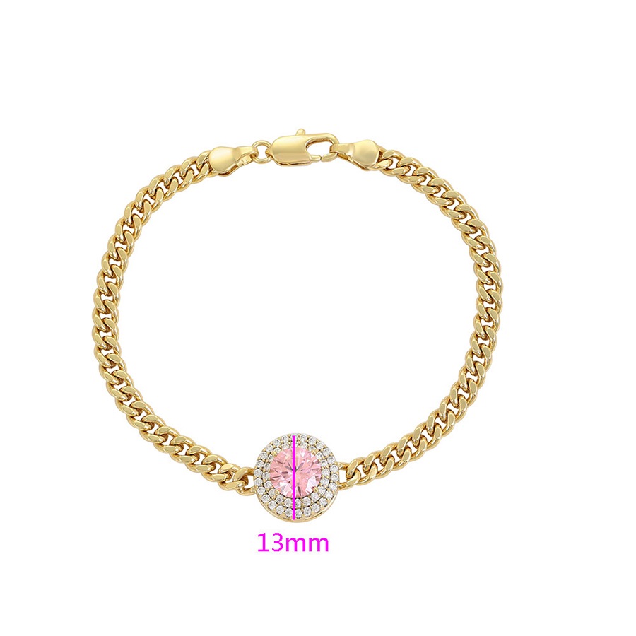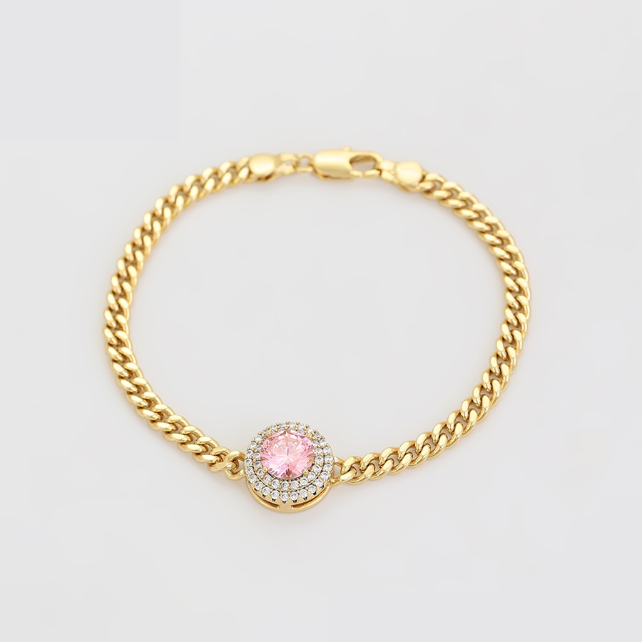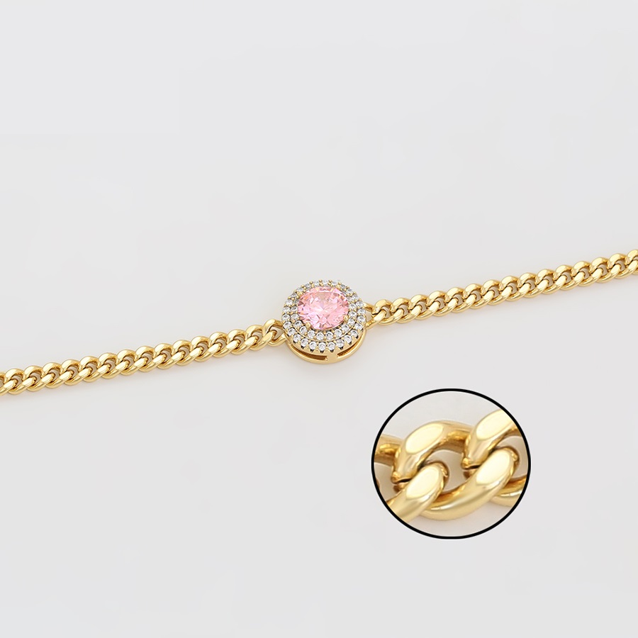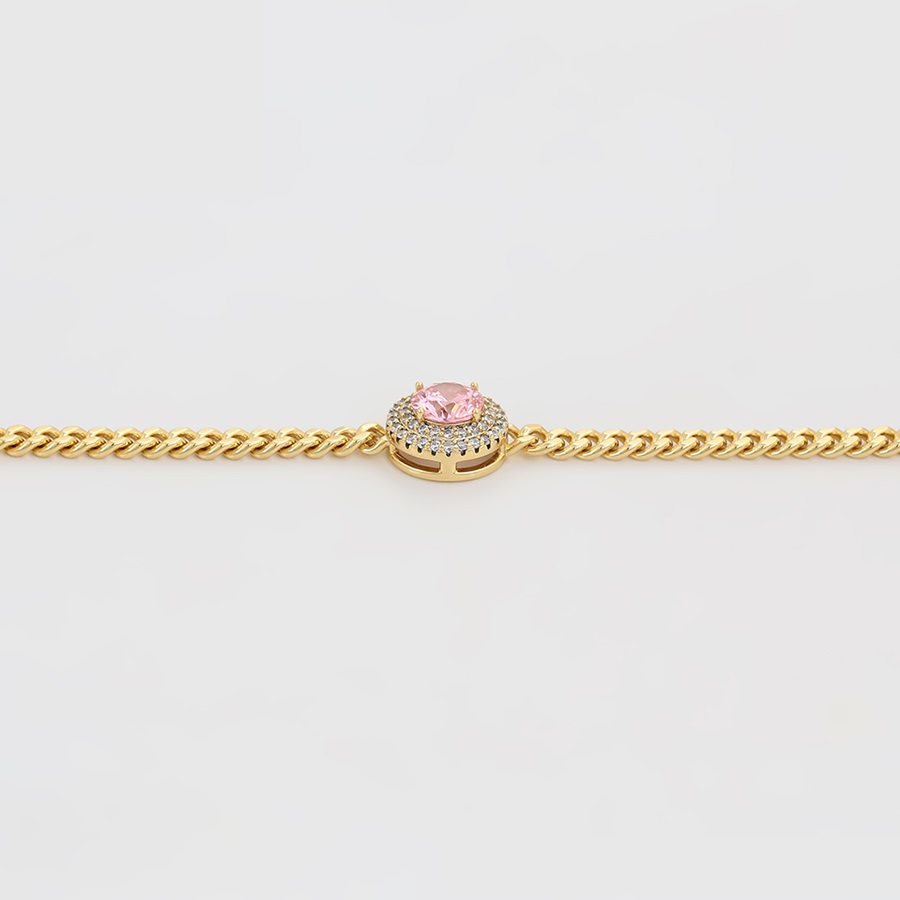 Brățara placată cu aur Pink charm este o bijuterie elegantă și strălucitoare, care îmbină farmecul metalului prețios cu sclipirea cristalelor, oferind astfel un aspect captivant și rafinat. Această brățară atrage privirile și evidențiază în mod subtil frumusețea încheieturii mâinii. Pe această structură de zale sunt inserate cristale pentru a accentua strălucirea bijuteriei. Acestea adaugă un plus de eleganță și strălucire brățării, reflectând lumină în mod atrăgător.