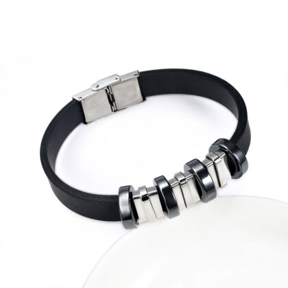 Bratara din silicon neagra cu insertii metalice este o combinație modernă și stilată între funcționalitate și design elegant. Fabricată din silicon, această brățară emană un aer contemporan și practic, fiind totodată un element distinctiv al oricărei ținute.