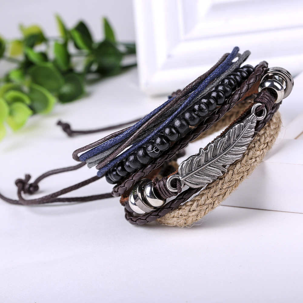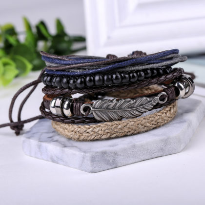 Bratara retro, cu pandantiv pana este compusa din patru bratari puse impreuna dintre care doua sunt de piele, una din sfoara impletita si una din margele negre. Produsul poate fi usor accesorizat si poate fi purtata atat de dame cat si de barbati.