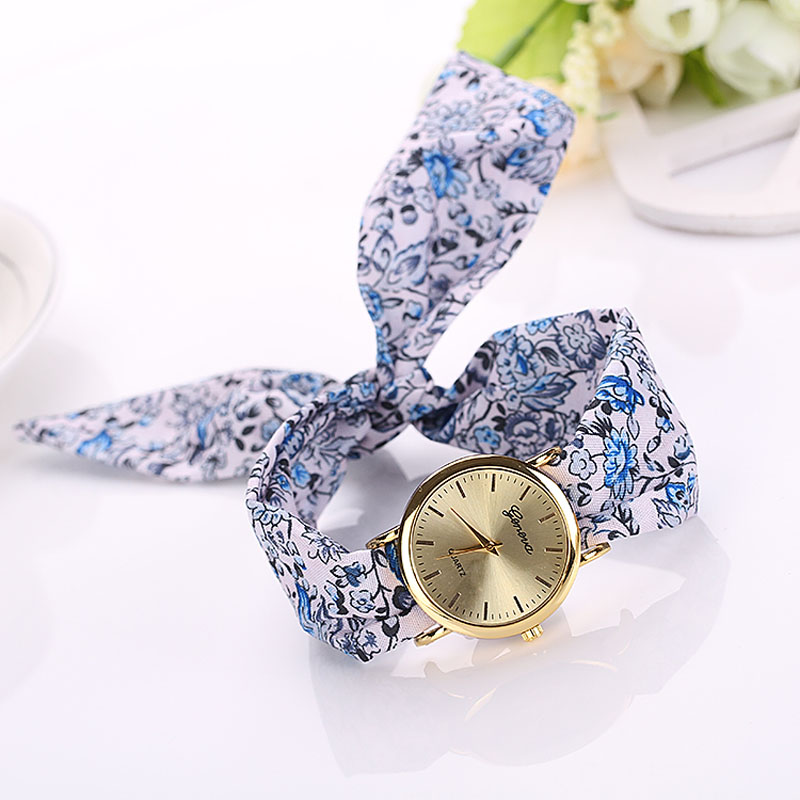 Ceasul de mana de la Geneva are un imprimeu albastru unic si elegant. Brățara este lungă, având un design care îmbrățișează încheietura mâinii într-un mod elegant. Este decorată cu un model floral, adăugând un element delicat și feminin. Aceste detalii florale ofera un aspect natural și romantic. Cadranul este de culoare aurie, oferind un fundal strălucitor pentru detaliile florale și creând un contrast elegant.