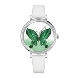 Ceas alb Yazole fluturas verde este o bijuterie care emană eleganță și naturalețe. Bratara din piele ecologică alba conferă ceasului un aspect rafinat și clasic. Cadranul argintiu oferă un aspect strălucitor și sofisticat, în timp ce interiorul alb adaugă un contrast perfect. Fluturele mare, de culoare verde, plasat pe cadranul ceasului adaugă un element distinctiv și delicat. Acest detaliu subliniază eleganța și aduce o notă de naturalețe, dând ceasului o personalitate unică.