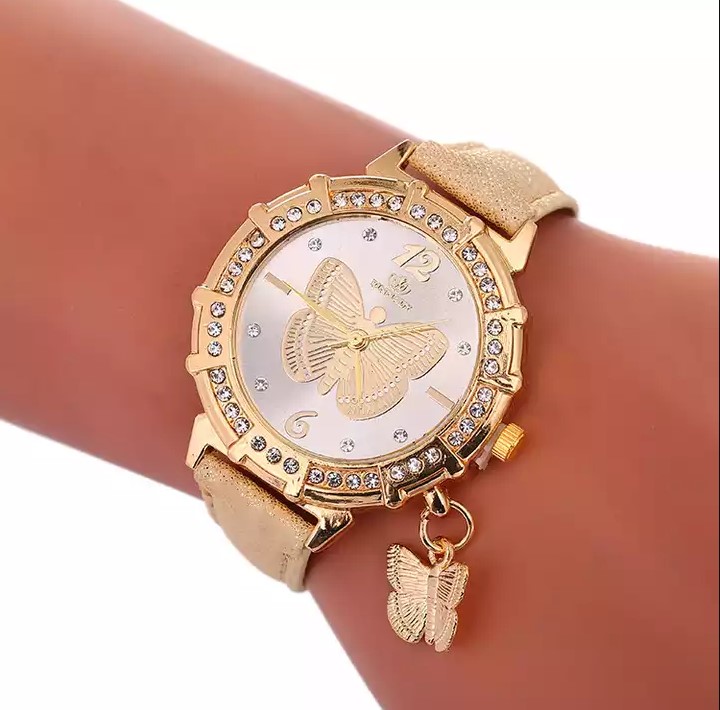 Cadrul ceasului este realizat într-un ton auriu strălucitor si incastrat cu cristale zirconiu strălucitoare care adaugă un element de glamour și scânteie designului. Fluturașul este un element de design distinct, care adaugă un farmec special și un accent romantic ceasului. Curea este fabricată din piele ecologică aurie, care are un aspect asemănător cu pielea naturală, dar este prietenoasă cu mediul. Această alegere de material adaugă un aspect sofisticat și strălucire ceasului.
