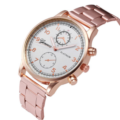 Ceasul de mana de la Geneva Platinum este o alegere perfecta ca accesoriu pentru tinute office sau casual. Ceasul iese in evidenta prin bratara metalica aurie si prin cadranul generos, cu interior alb si cifre arabe. Modelul modern il face usor de asortat si are mecanism quartz.