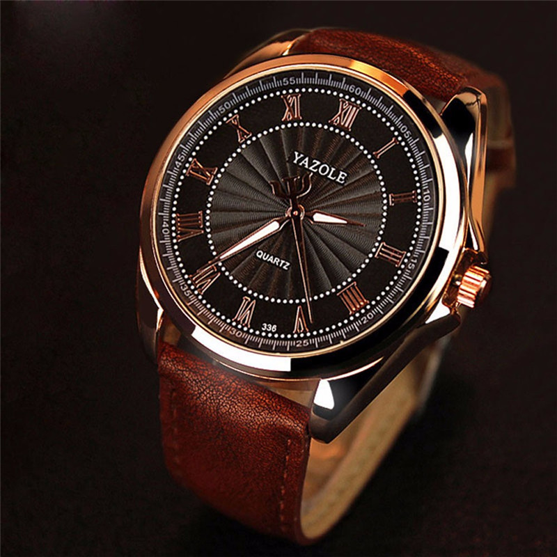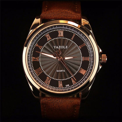 Ceasul de mana de la Yazole este o alegere perfecta ca accesoriu pentru tinute office sau casual. Ceasul iese in evidenta prin cureaua din piele maro si prin cadranul de 4,5 cm diametru auriu, cu interior in degrade maro si cifre romane. Modelul modern il face usor de asortat si are mecanism quartz.