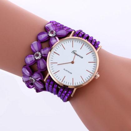 Ceasul Geneva este o bijuterie strălucitoare și sofisticată. Brățara lungă, confecționată din cristale mov în forma de flori, emană un farmec aparte și adaugă o notă de rafinament. Lungimea generoasă a brățării permite o purtare confortabilă și elegantă, evidentiand frumos încheietura mâinii. Cadranul alb cu detalii aurii completează ansamblul, adăugând un contrast elegant și facilitând citirea orei.