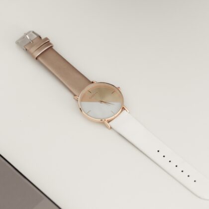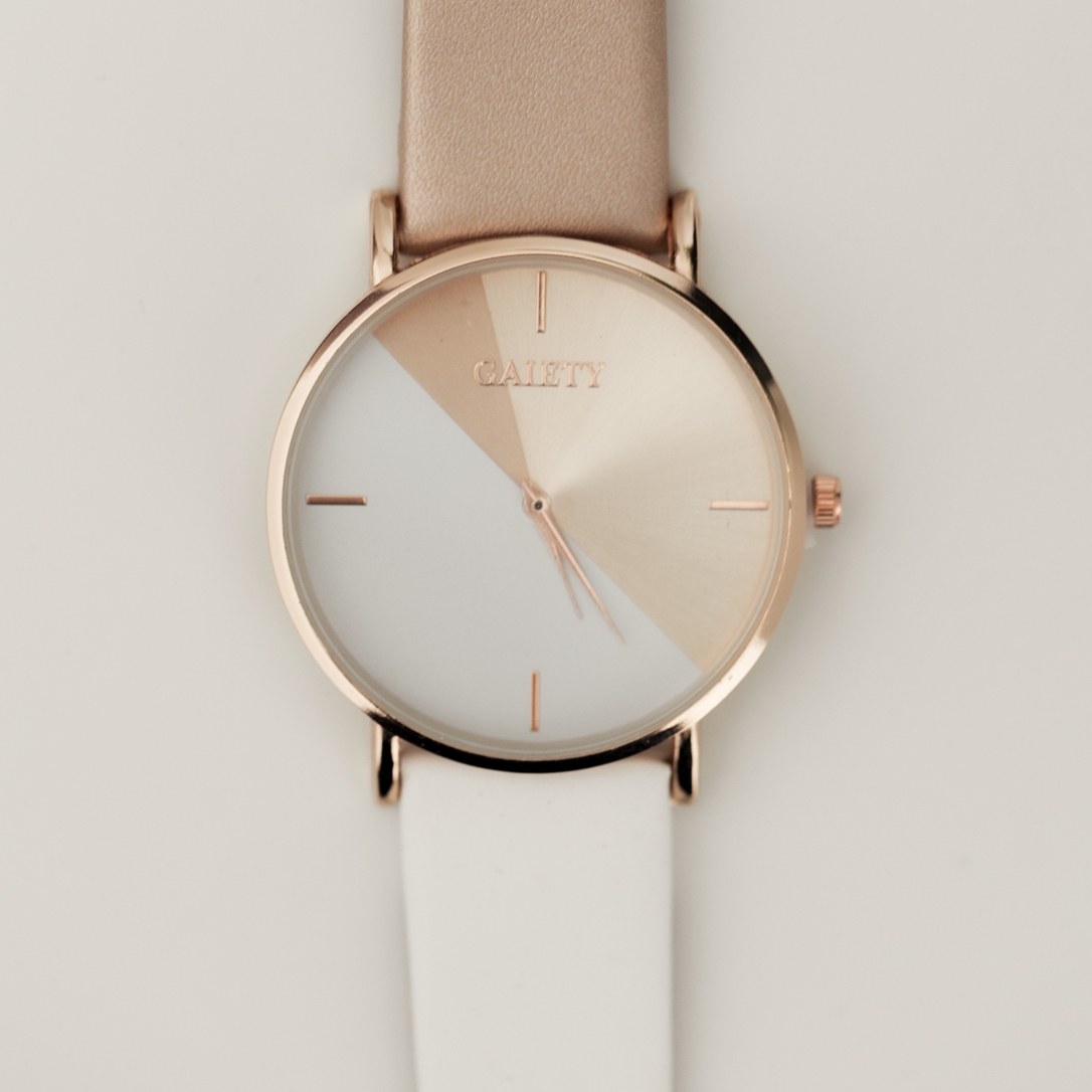 Ceasul dama elegant alb-bej este o alegere perfecta ca accesoriu, datorita designului modern si usor de asortat. Bratara din piele ecologica de culoare alb-auriu si cadranul in acelasi ton fac acest ceas potrivit pentru a fi accesorizat cu diverse stiluri vestimentare.