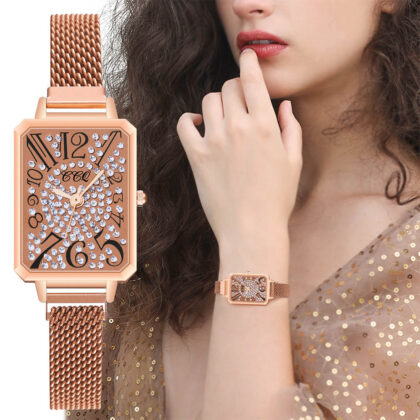 Ceasul de dama inchidere magnetica este o bijuterie strălucitoare și sofisticată, potrivită pentru a adăuga un strop de eleganță oricărei ținute. Detaliile atent lucrate, precum și închiderea magnetică a brățării, fac din acest ceas un accesoriu deosebit. Cadranul dreptunghiular este accentuat de strălucirea discretă a cristalelor, oferind ceasului un aspect rafinat și luxos.