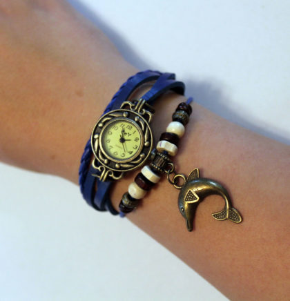 Ceas de mana cu bratari de piele albastre si decoratiuni