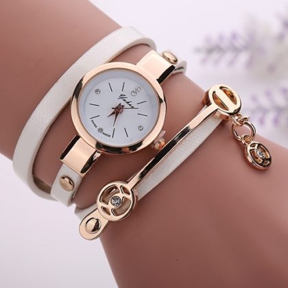 Ceasul de mana curea alba se distinge prin eleganța sa simplă și rafinată. Cureua alba, cu o lungime de 55 cm, oferă un confort sporit și permite ceasului să fie purtat cu grație în jurul încheieturii mâinii. Detaliile aurii adaugă o notă glamour ceasului, creând un contrast elegant cu fundalul alb.