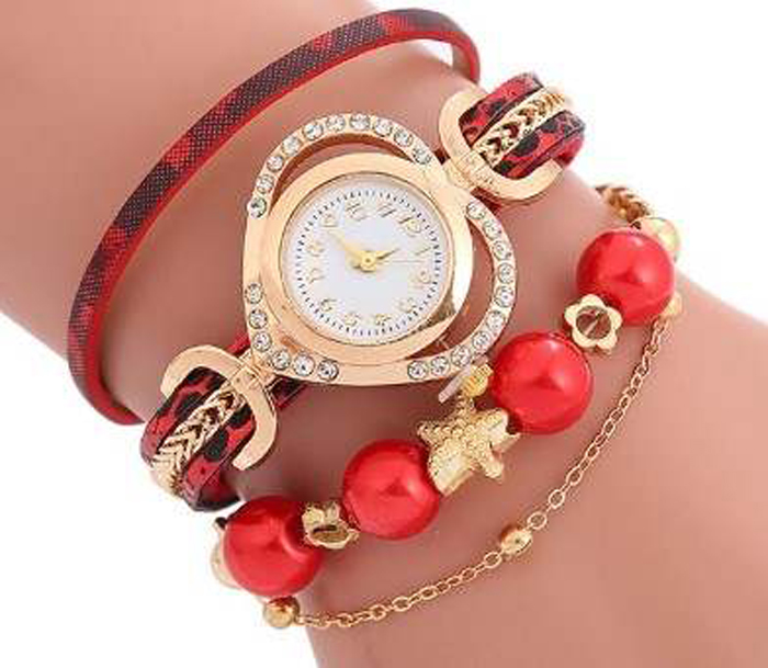 Ceasul de mana rosu inimioara cu stelute si mecanism quartz este o alegere perfecta ca accesoriu, datorita designului modern si usor de asortat. Cadranul este în formă de inimioară, adăugând un element romantic și feminin. Culoarea aurie conferă un aspect luxos și sofisticat. Totodata, pe marginea acestuia sunt  încrustate cristale, care ofera un plus de strălucire și eleganță. Bratara este decorata cu margele rosii si stelute aurii.