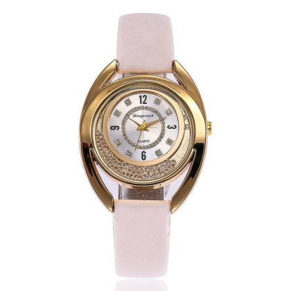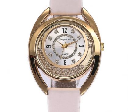Ceasul elegant cu cristale si curea alba este un model elegant si sofisticat. Cadranul are un fond alb, oferind un contrast puternic si este inconjurat detalii aurii. Brățara, confecționată din piele ecologica de culoare alba este subtire si adaugă un element de subtilitate și eleganță accesoriului. Ceasul funcționează cu un mecanism quartz, asigurând o precizie remarcabilă în măsurarea timpului.