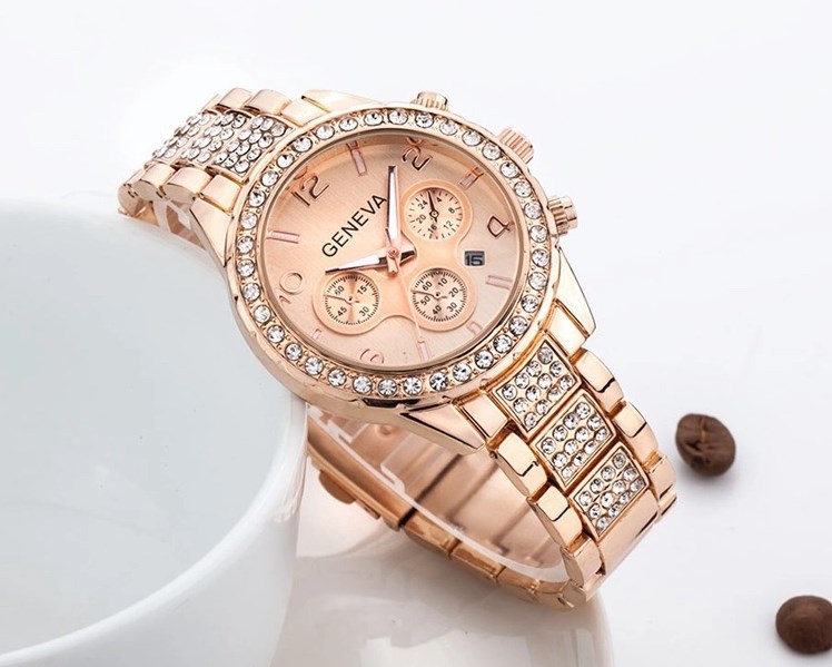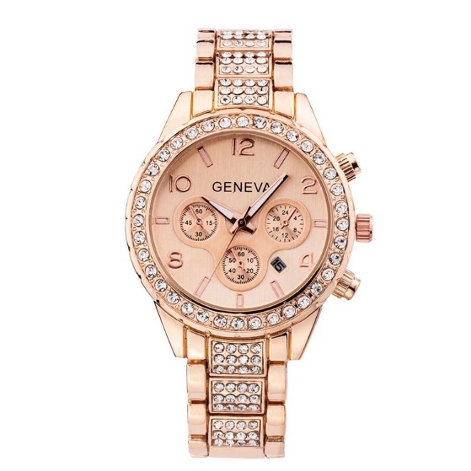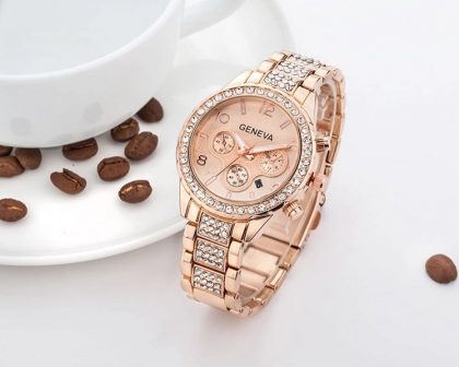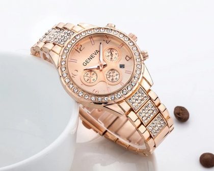 Ceasul Geneva cu mecanism quartz emană eleganță și strălucire, aducând un strop de lux în accesorizarea ta. Brățara si cadranul sunt încrustate cu cristale, adăugând un element strălucitor și atrăgător.