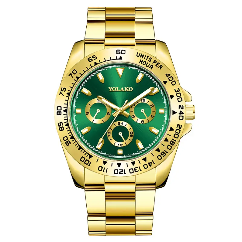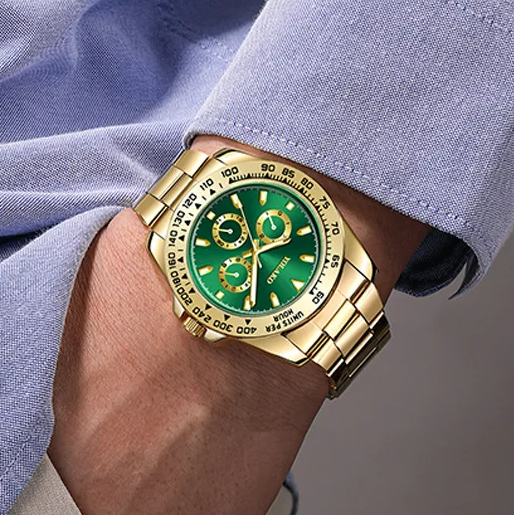 Ceasul metalic auriu cadran verde este o bijuterie de mână elegantă și distinctivă, care emană stil și rafinament. Metalul auriu îi conferă o notă clasică și rafinată ceasului, iar textura și strălucirea acestuia pot completa aspectul general al accesoriului.