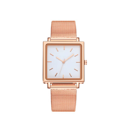 Ceas roze bratara metalica cadran patrat emana o eleganta moderna si simpla. Cadranul patrat confera ceasului un aspect contemporan, distinct si original. Bratara metalica aurie aduce un element clasic si stralucitor ceasului. Auriul se potriveste cu diverse culori si stiluri vestimentare. Cu un mecanism quartz, ceasul ofera o afisare precisa a timpului.