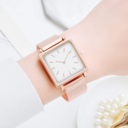 Ceas roze bratara metalica cadran patrat