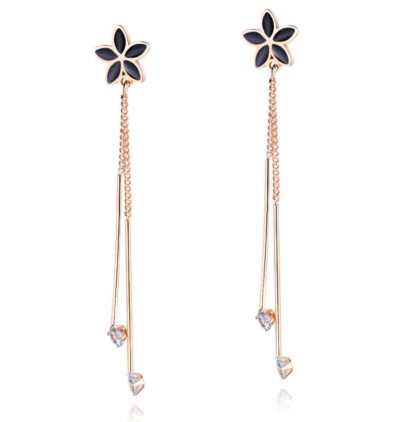 Partea superioară a cerceilor este decorată cu o mică floricică neagră, care adaugă un contrast frumos la aurul strălucitor. Forma lunga a cerceilor oferă o notă de eleganță și rafinament, alungind vizual gâtul și accentuând forma feței. Acești cercei pot fi purtați la diverse ocazii, de la evenimente formale la serate romantice sau chiar la evenimente de zi cu zi, pentru a adăuga un strop de stil oricărei ținute.