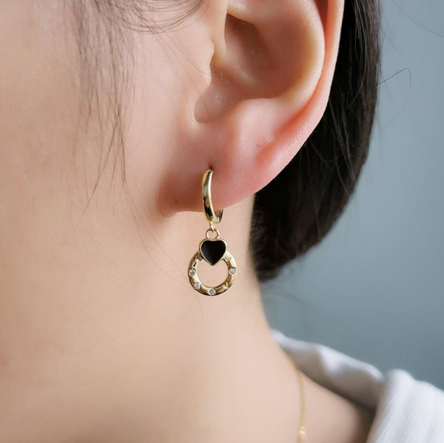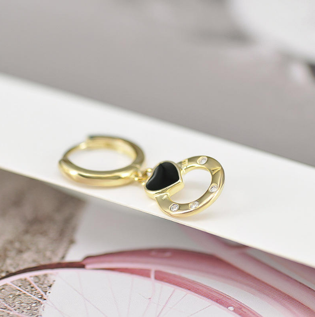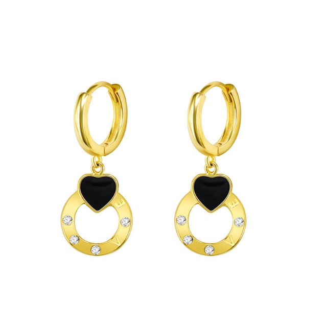 Cerceii placati aur inimioara LOVE  sunt o expresie adorabilă a romantismului, combinând un design simplu și elegant cu un mesaj subtil de iubire. Fiecare cercei este format dintr-o inimioară neagră, simbolizând pasiunea și emoțiile profunde.