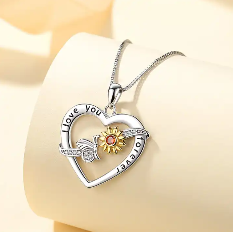 Design-ul colierului prezintă o albinuță stilizată plasată langa floarea soarelui, ambele elemente fiind amplasate cu grijă într-un contur subtil în formă de inimioară. Această inimioară simbolizează dragostea și gingășia, iar albinuța și floarea soarelui aduc în design un aer proaspăt și primăvăratic.